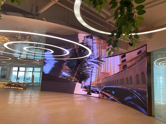该项目位于华世界深圳总部大厅内,大屏以内弧形式安装,沉浸式体验数字商业化服务,采用P2.5高清显示屏,面积达40㎡,安装无拼缝、无限拼接大屏、显示画面高清靓丽,支持3D、4D、5D效果播放,具有更加立体、逼真的显示效果。
