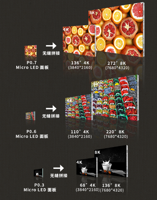 (1)一个晶圆(wafer)的芯片即可制造一个4k/8k屏,光电参数一致性高;
