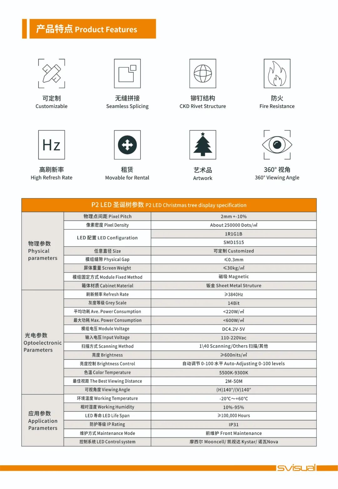 极致创意自主研发的LED圣诞树是行业首创新品,独有的模组切斜边设计工艺,是的棱角更加平滑,缝隙更小,采用点间距为P2,开发了多款异形模组,模组设计了GOB ,具有防潮、防尘等特点。