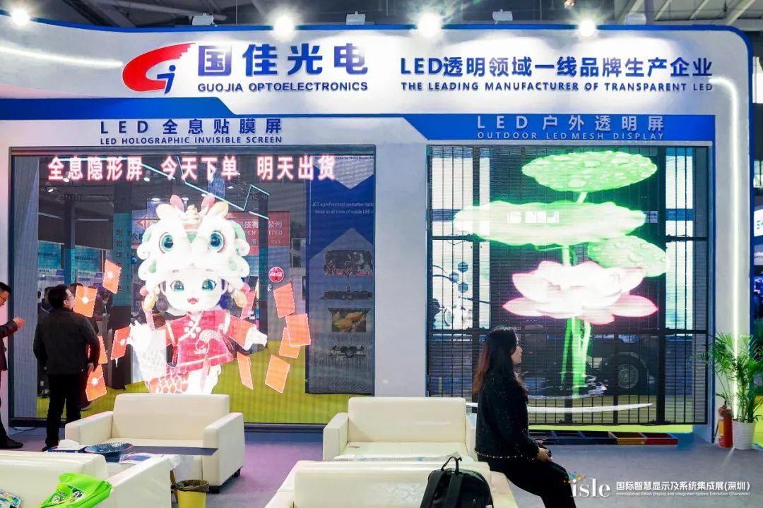 在2025 ISLE展会上,国佳光电携LED全息隐形屏、LED晶膜屏和LED光电玻璃屏亮相,其LED全息隐形屏通透率达90%,能无缝贴合玻璃,可裁剪弯曲;LED晶膜屏轻薄柔软,支持异形曲面展示;LED光电玻璃屏通电显图、断电透明,这些产品为高端零售橱窗、舞台舞美、建筑媒体立面等场景提供独特透明显示解决方案。