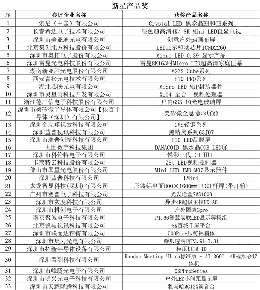 本次奖项包括“优秀产品奖”、“新星产品奖”、“创新奖”及“ISLE2023创新金奖产品”、“最佳展示奖”。经过申报资料前期评审和参展产品现场考评,最终选出了新星奖33家,优秀奖43家,智能显示一体机创新奖12家、LED沉浸式显示系统创新奖10家、LED裸眼3D显示创新奖10家、专精特新奖20家、创新金奖3家、最佳展示奖1家。
