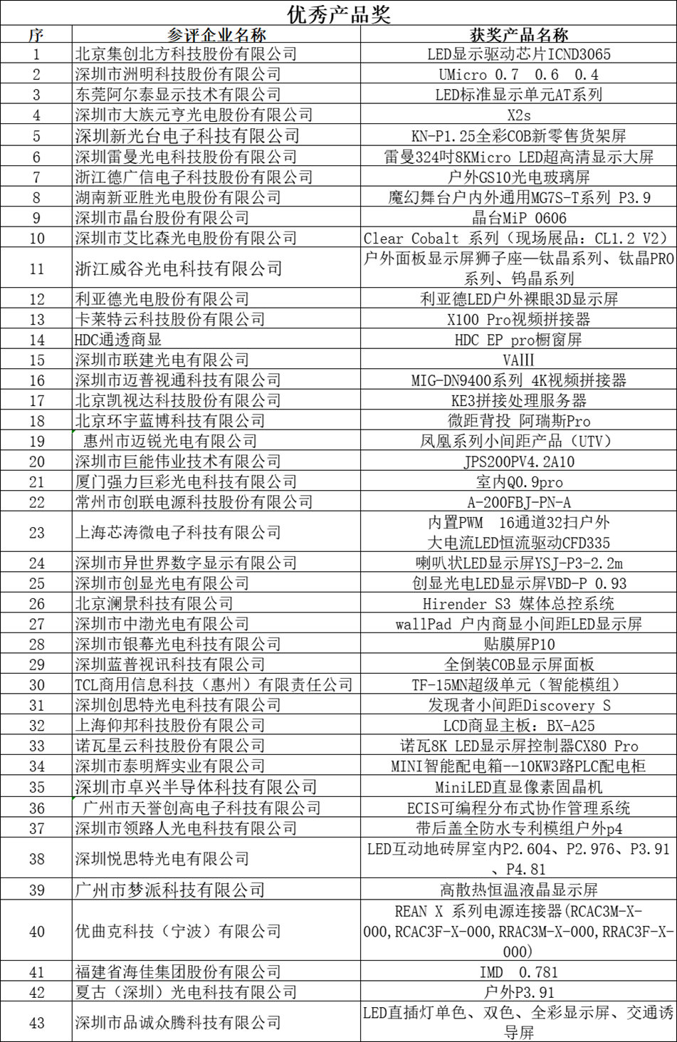 本次奖项包括“优秀产品奖”、“新星产品奖”、“创新奖”及“ISLE2023创新金奖产品”、“最佳展示奖”。经过申报资料前期评审和参展产品现场考评,最终选出了新星奖33家,优秀奖43家,智能显示一体机创新奖12家、LED沉浸式显示系统创新奖10家、LED裸眼3D显示创新奖10家、专精特新奖20家、创新金奖3家、最佳展示奖1家。