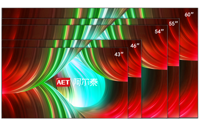 采用 AET 阿尔泰第三代控制架构,拥有五个国际标准尺寸规格 43吋、46 吋、54吋、55 吋、60 吋,屏幕宽高比 16:9,模组厚度最薄可达 28.3m,接近于一元硬币直径,视域超 160”,观看无死角、无偏色,清晰度无封顶,兼容传统LCD 安装尺寸及孔位,无缝衔接替代 LCD/DLP 产品。