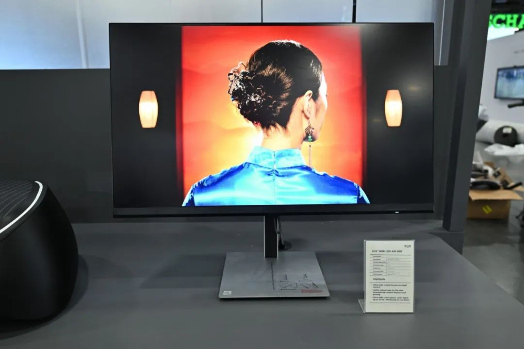 京东方展示了行业内尺寸最大的31.5英寸4K玻璃基主动式Mini LED显示器,通过行业领先的多达4608颗背光Mini LED灯珠和1152个超高分区,实现前所未有的精准控光,更有百万级超高对比度、1000nits超高亮度、144Hz超高刷新率及高达99%的DCI-P3色域,带来极致的视觉效果,全方位满足电竞、影音剪辑、平面设计以及座舱后排娱乐大屏等多场景使用需求。